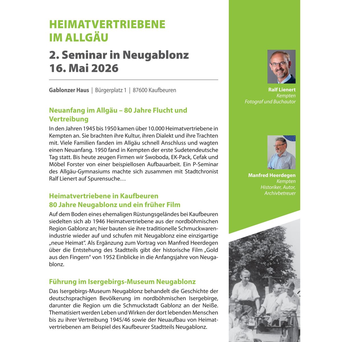 veranstaltet am Samstag, 16. Mai 2026 ein Seminar zum Thema „Heimatvertriebene im Allgäu“ im Gablonzer Haus , Bürgerplatz 1 in Neugablonz.Das Seminar richtet sich an alle, die sich für das Thema interessieren und dauert von 9:00 bis ca. 15:00 Uhr. Referenten sind der Buchautor Ralf Lienert aus Kempten mit dem Vortrag „Neuanfang im Allgäu – 80 Jahre Flucht und Vertreibung“ und der Historiker Manfred Heerdegen mit dem Referat „Heimatvertriebene in Kaufbeuren – 80 Jahre Neugablonz und ein früher Film“. Am Nachmittag führt Manfred Heerdegen die Teilnehmer durch das Isergebirgsmuseum und gibt Einblicke in die Geschichte der deutschsprachigen Bevölkerung im Isergebirge bis zu ihrer Vertreibung sowie dem Neuaufbau im heutigen Kaufbeurer Stadtteil Neugablonz.