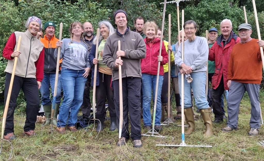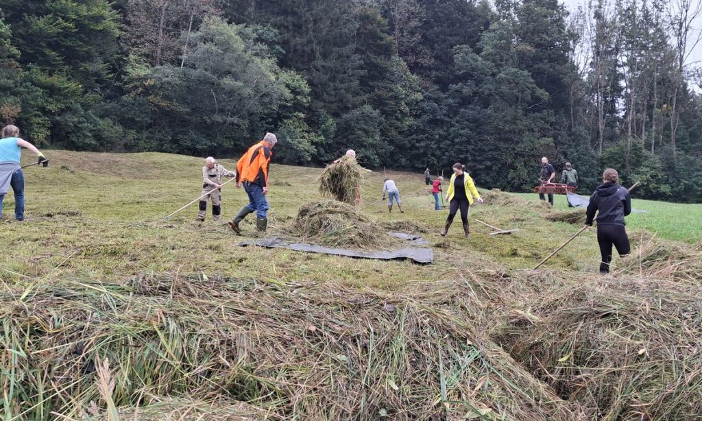 15 Helferinnen und Helfer waren unserem Aufruf gefolgt und befreiten die streng geschützte Feuchtwiese oberhalb des Bärensees von der einmal im Herbst durchgeführten Mahd. Nach dem Motto „Viele Hände, schnelles Ende“ packten alle kräftig mit an.